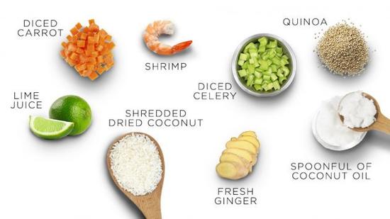 他吃午餐的大碗里装着椰子混合物(油,牛奶和豆腐干),它们含有脂肪酸,有助于保持心脏、大脑和免疫系统的健康;这样的大碗里还可以装下粟米,和小豆,做成沙拉。当然他也不会忘记搭配绿色的蔬菜作为配菜。