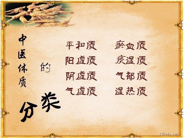 体质,即机体素质,是指人体秉承先天(指父母)遗传、受后天多种因素影响,所形成的与自然、社会环境相适应的功能和形态上相对稳定的固有特性。 至今国外医学对体质的各种分类学说都无法直接指导临床实践与养生康复,惟有中医体质学说与医疗实践、养生长寿密